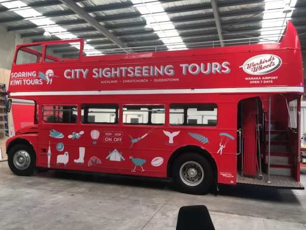 We have the room, Double Decker bus, white ink printed onto Cast High Performance vinyl, laminated and cut to shape. We did the whole fleet here and Auckland.