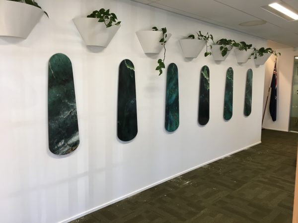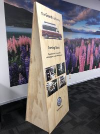 Bespoke Plywood sign, UV Direct print to face, Digitally cut shapes to manufacture freestanding display sign for trade show and then in the showroom. One of our own Phototex printed walls in our reception of the beautiful Lake Tekapo area showcases the Plywood Display.