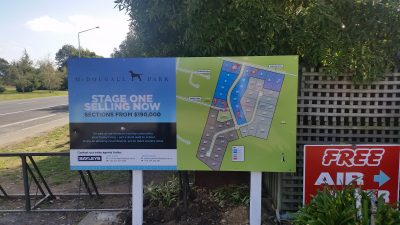 Sections for Sale, installed onto posts showcasing the new subdivision available.